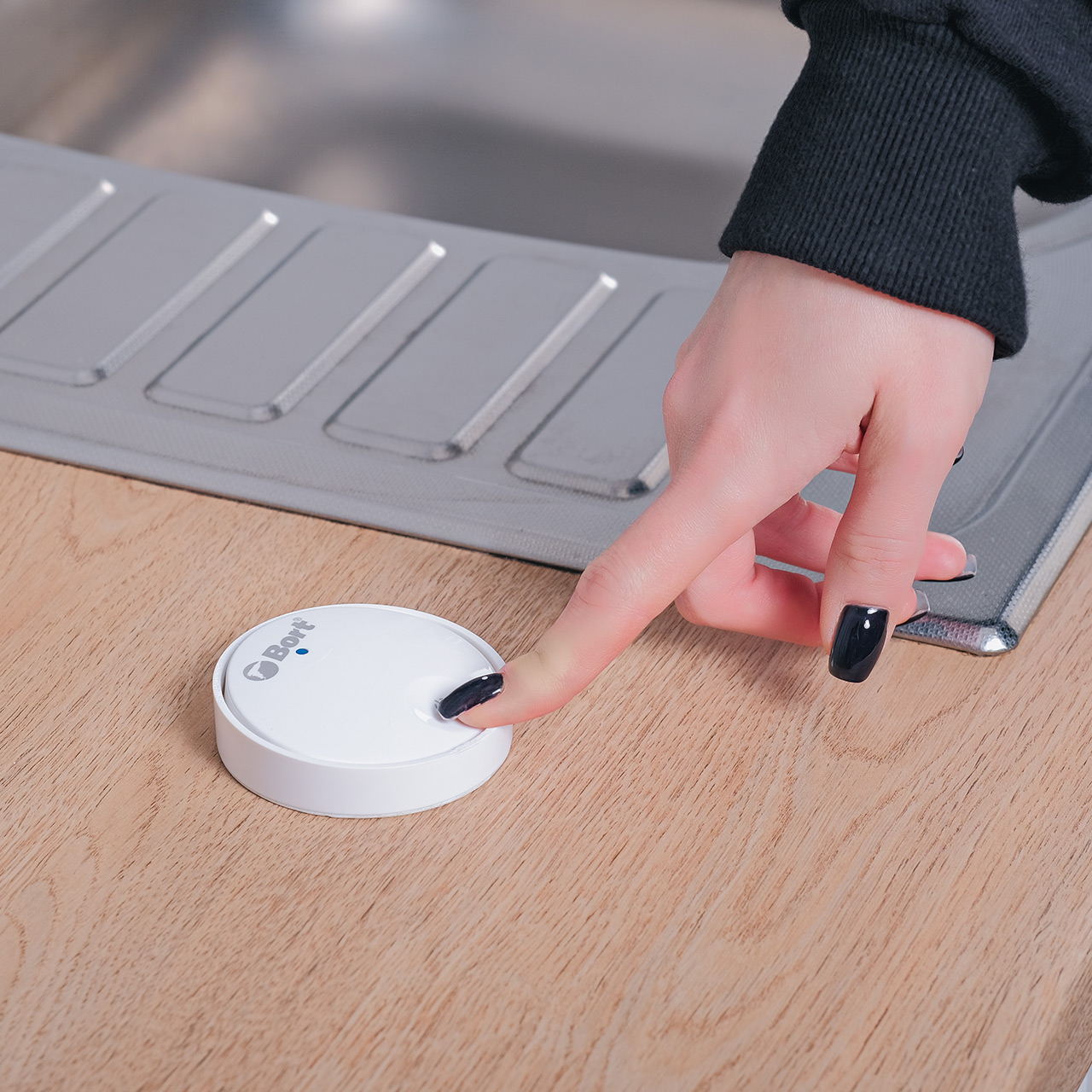 Управление происходит за счет беспроводной кинетической кнопки. Кнопка работает на пьезоэлементе, поэтому замена батарейки не требуется. Беспроводную кнопку можно приклеить в удобное или скрытое от детей место.