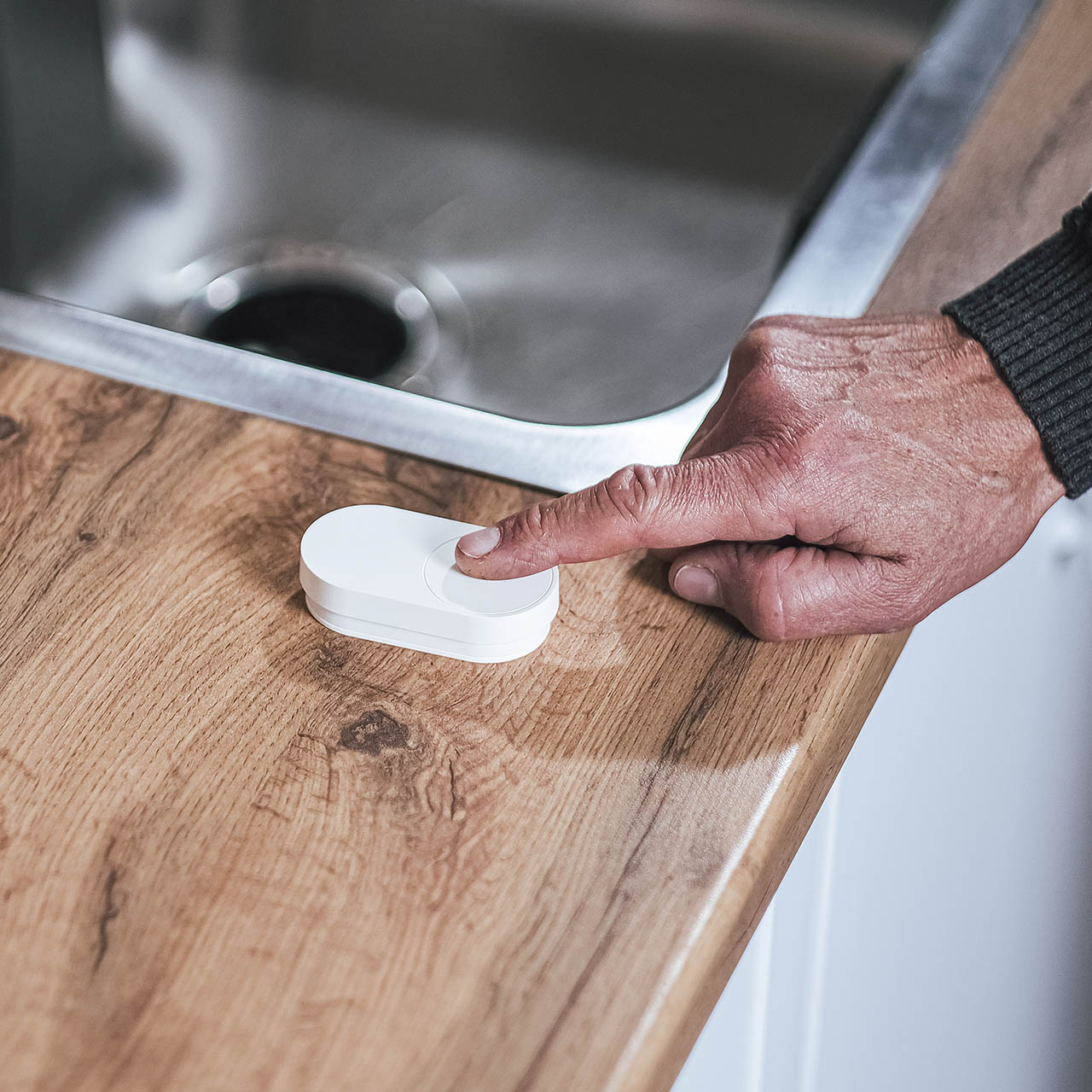 Управление происходит за счет беспроводной кинетической кнопки. Кнопка работает на пьезомеханизме, поэтому замена батарейки не требуется. Беспроводную кнопку можно приклеить в удобное или скрытое от детей место.