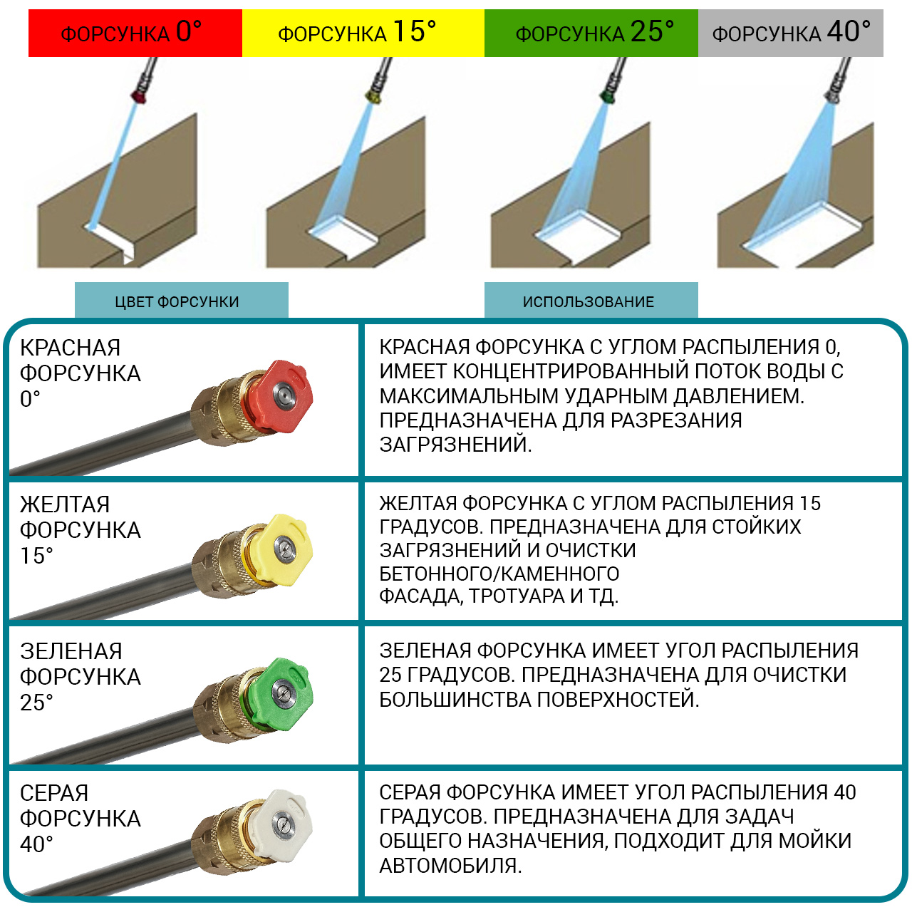 - Зеленая насадка: 25° веерообразная струя воды подходит для очистки больших площадей;